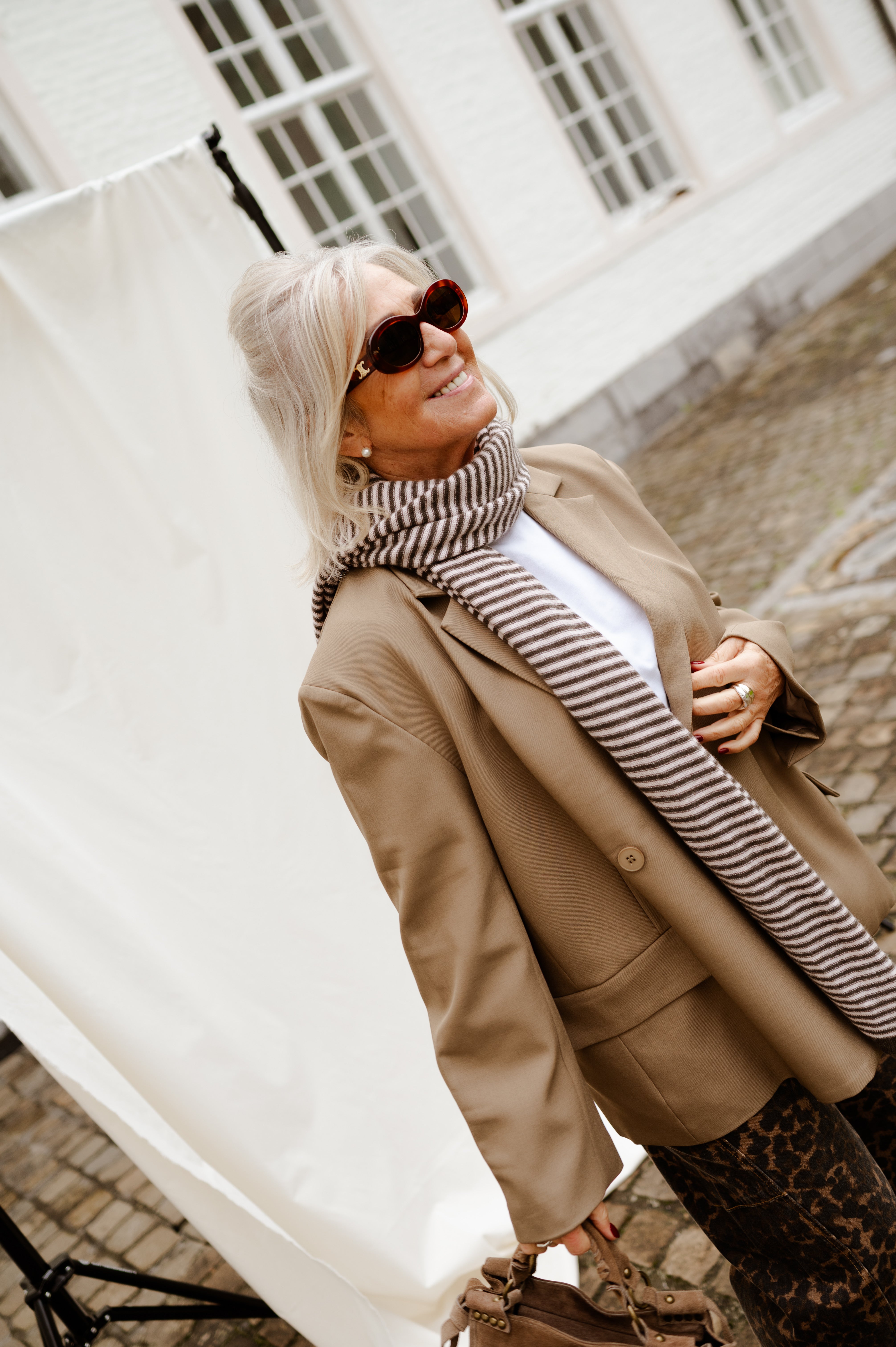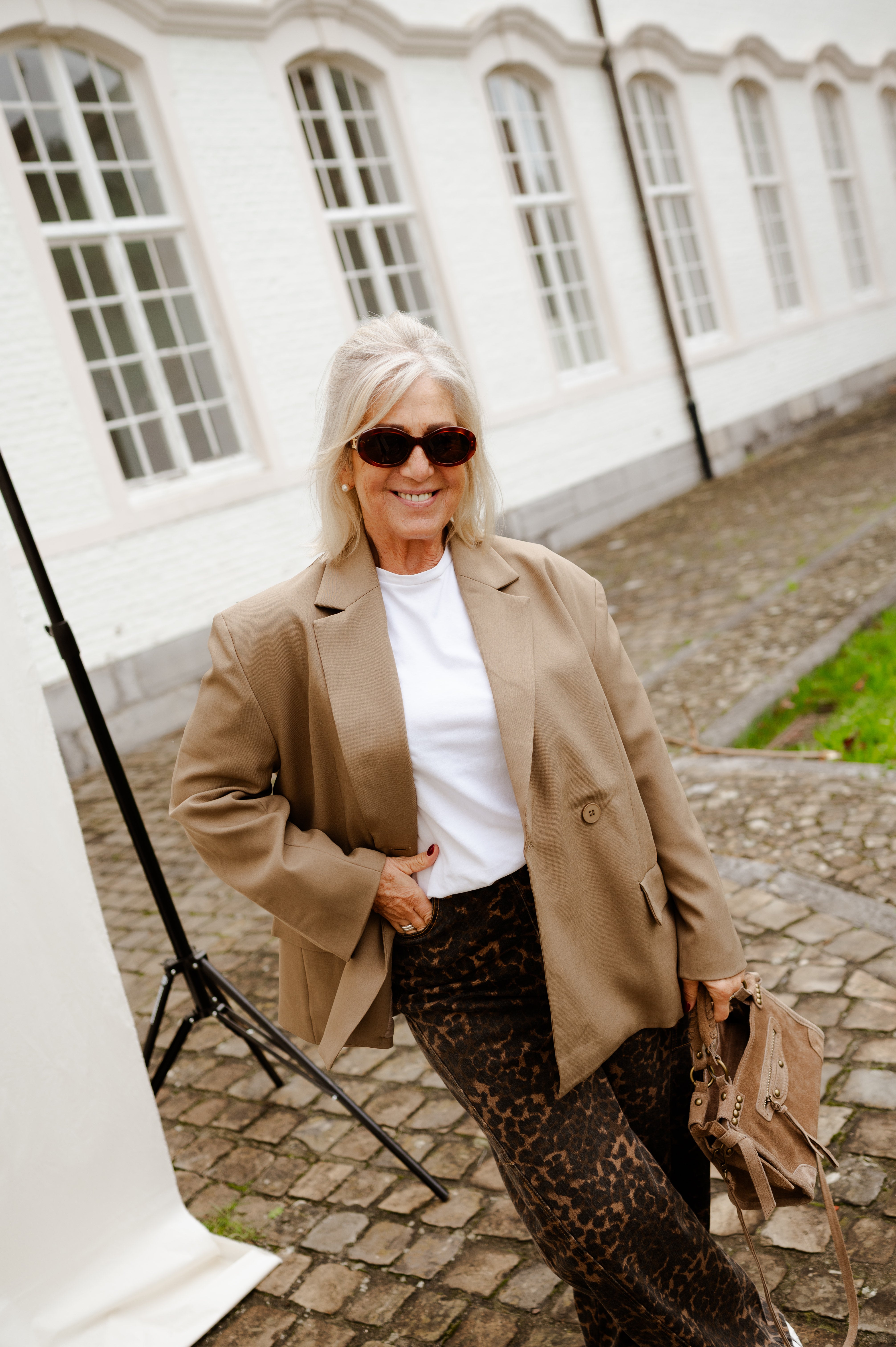 In deze blazer draagt zij maatje M/L voor een oversized effect