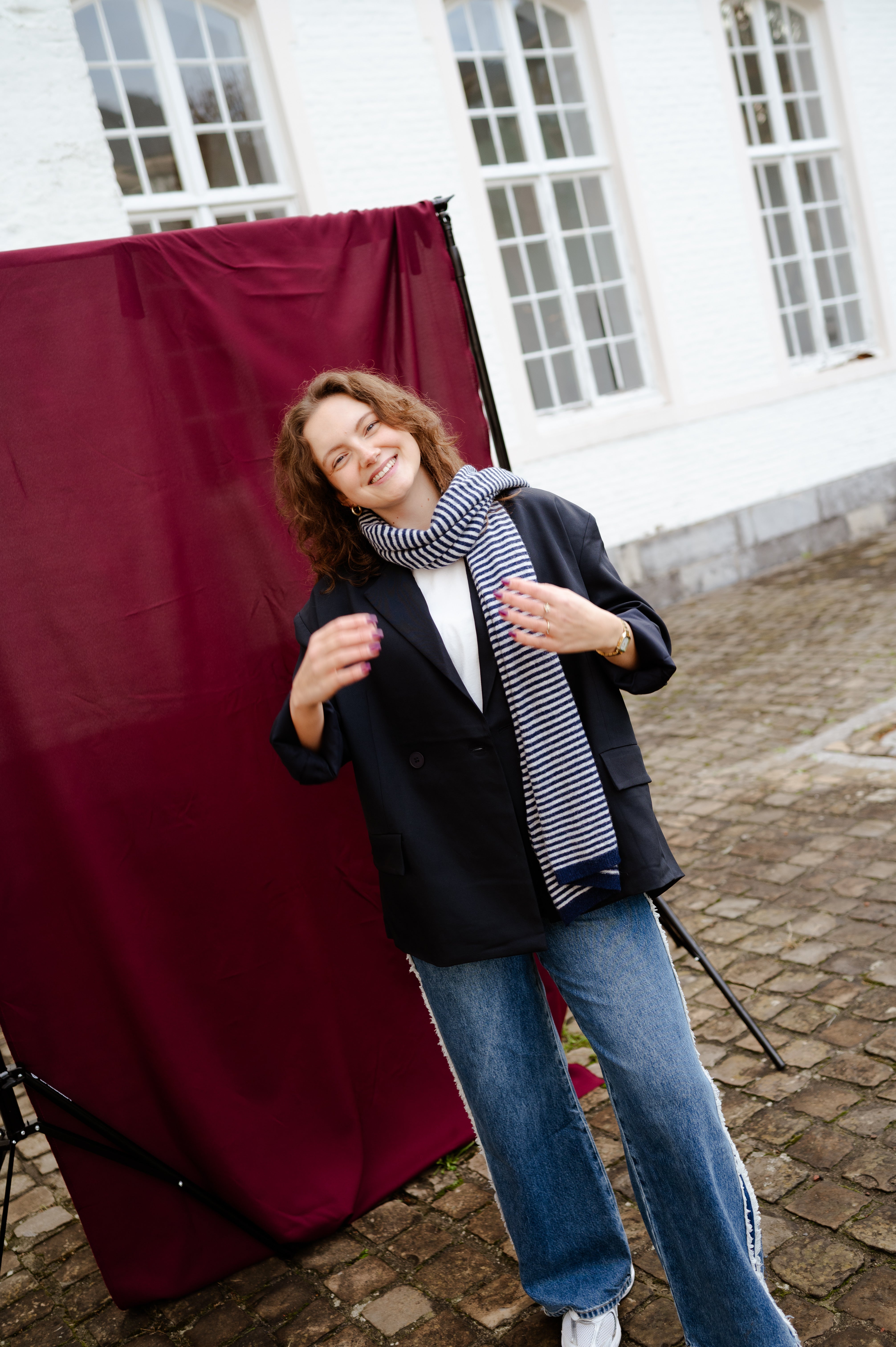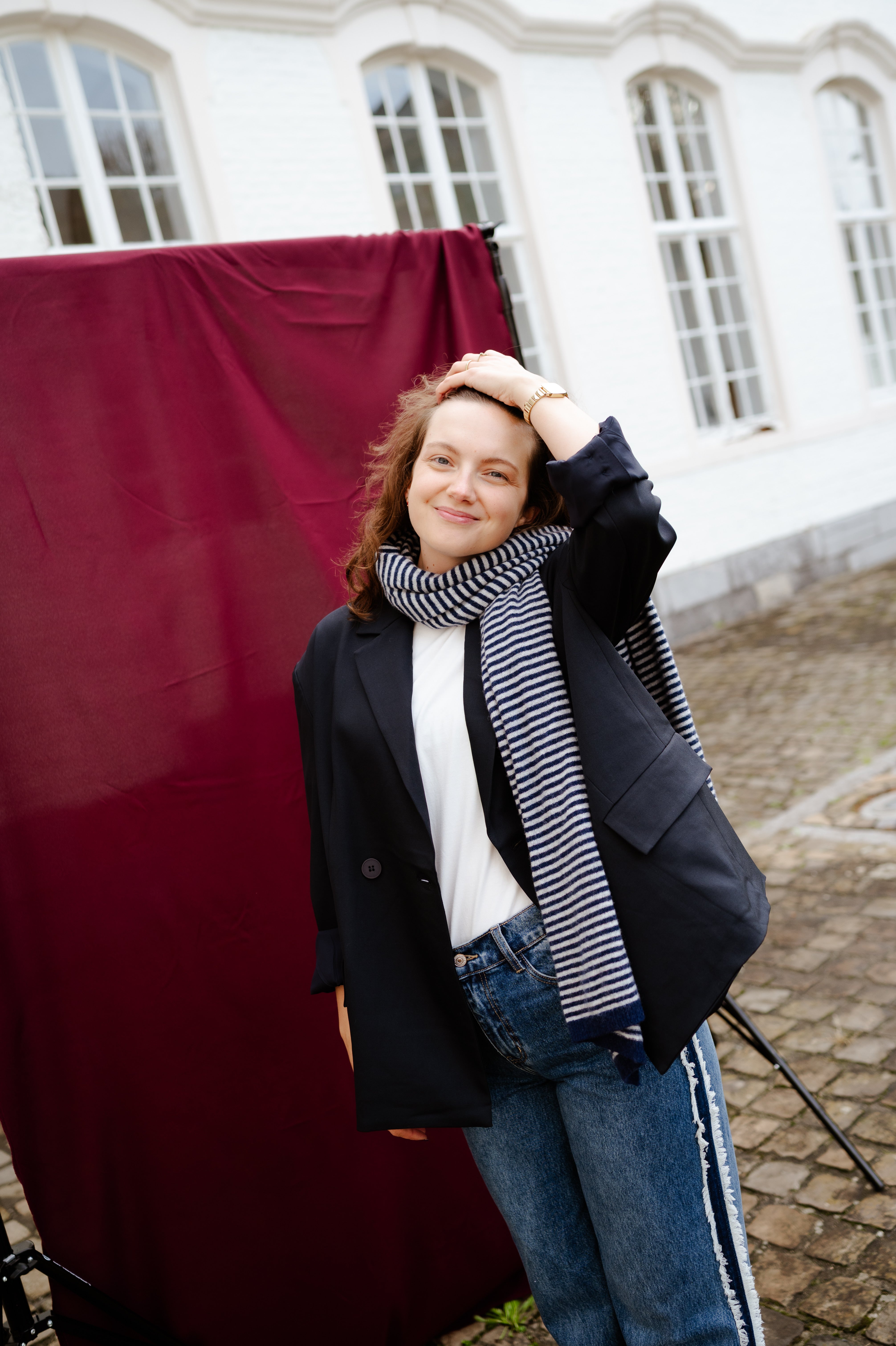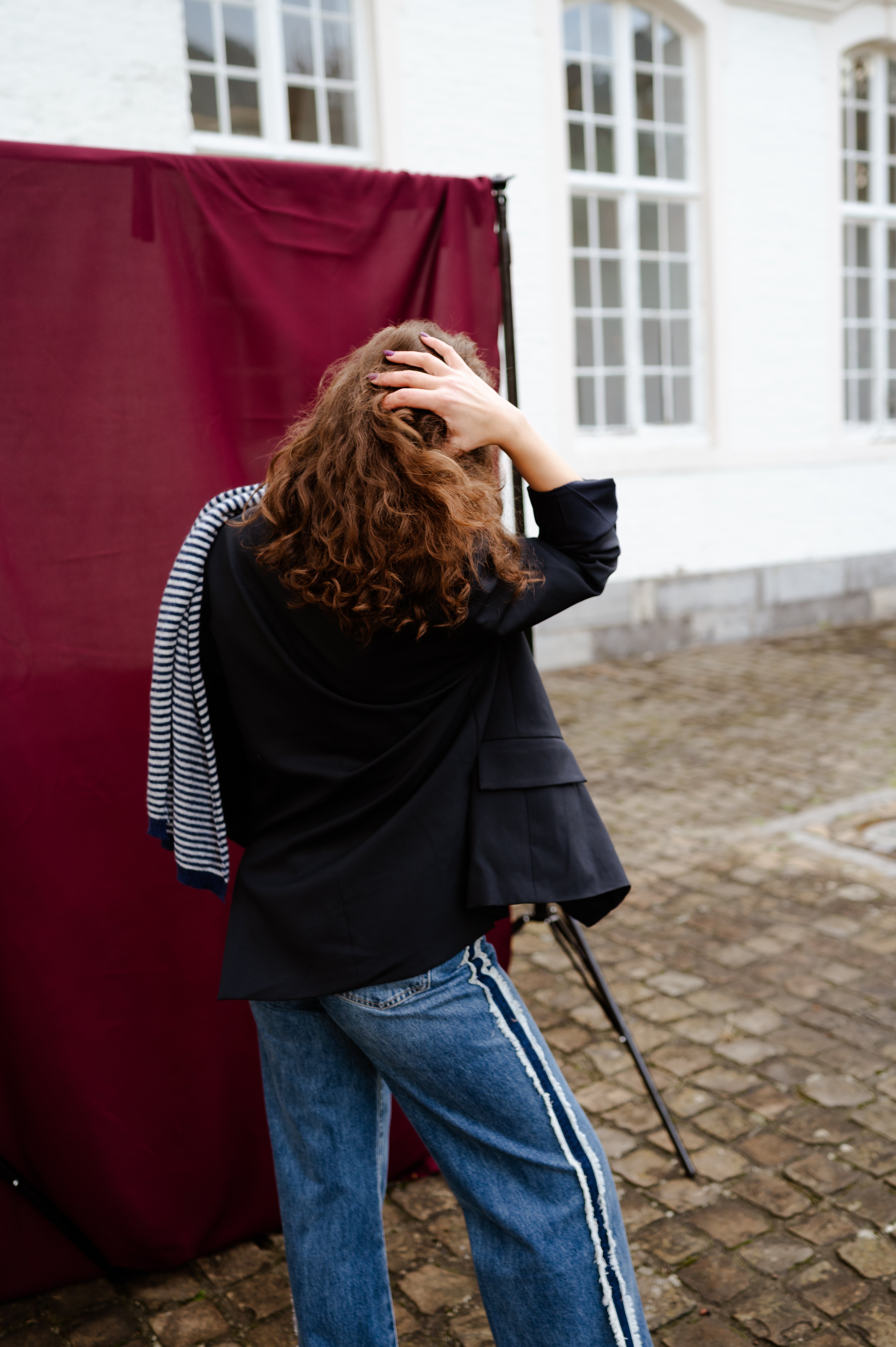 In deze blazer draagt zij maatje M/L voor een oversized effect