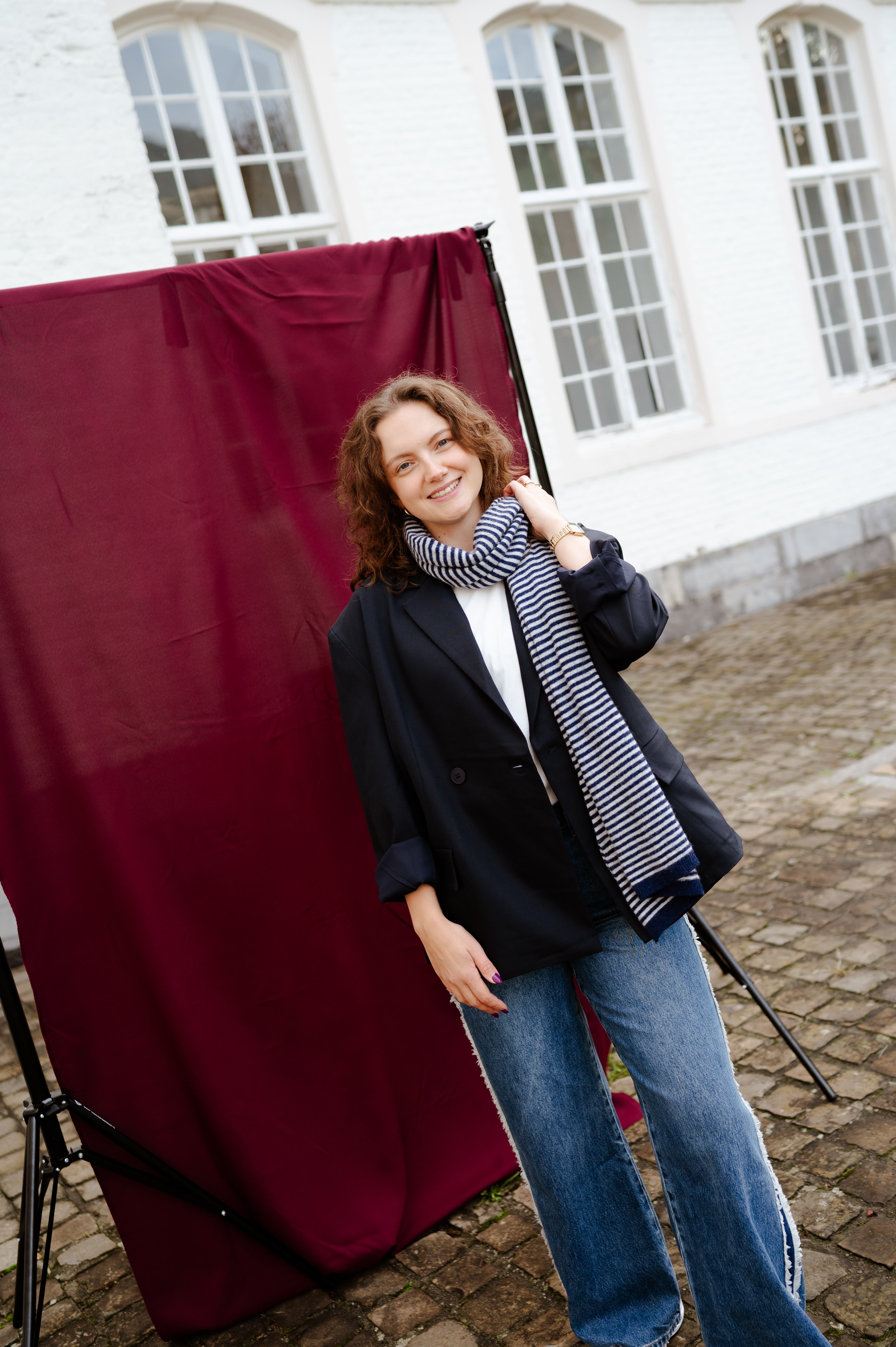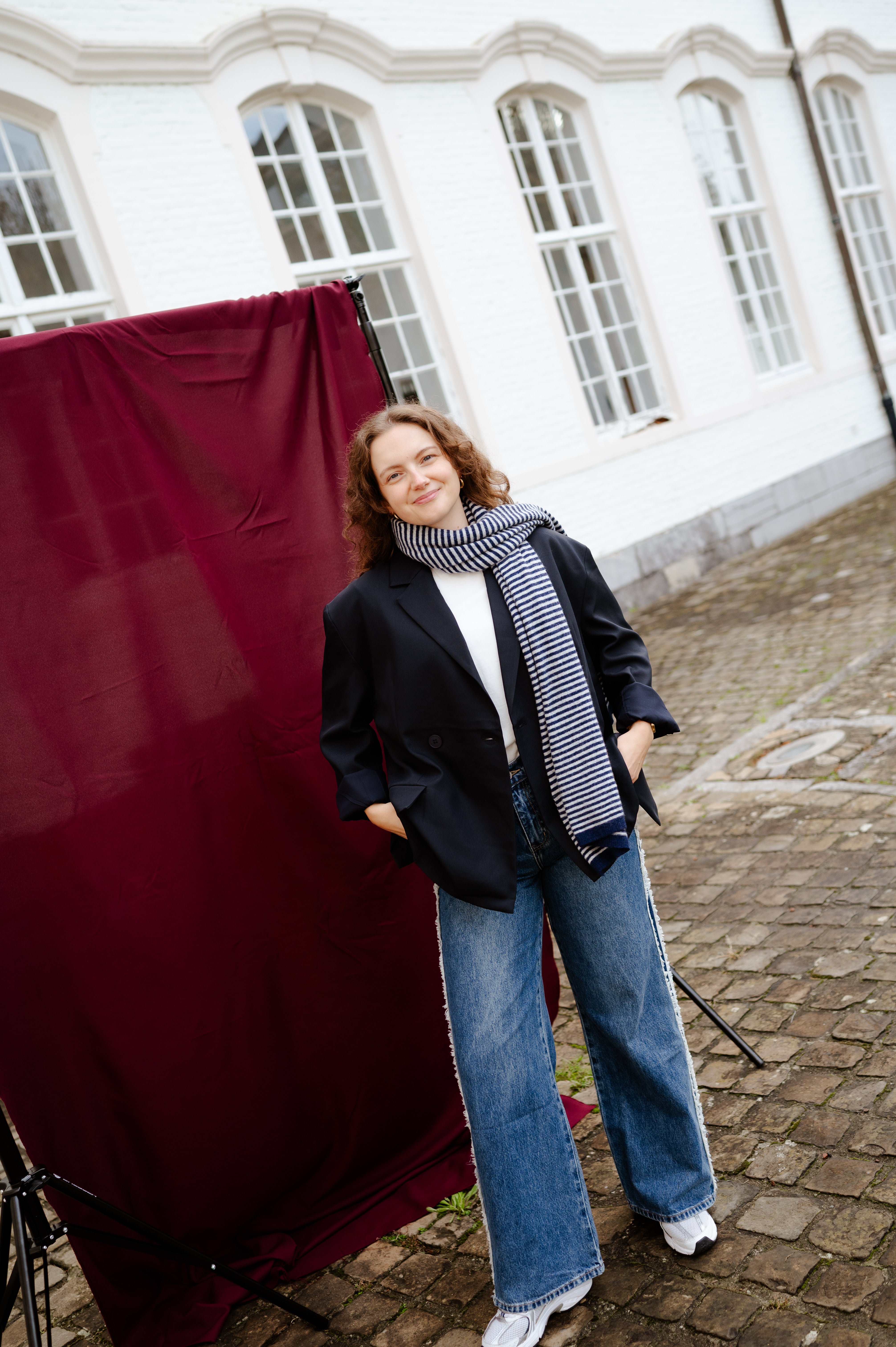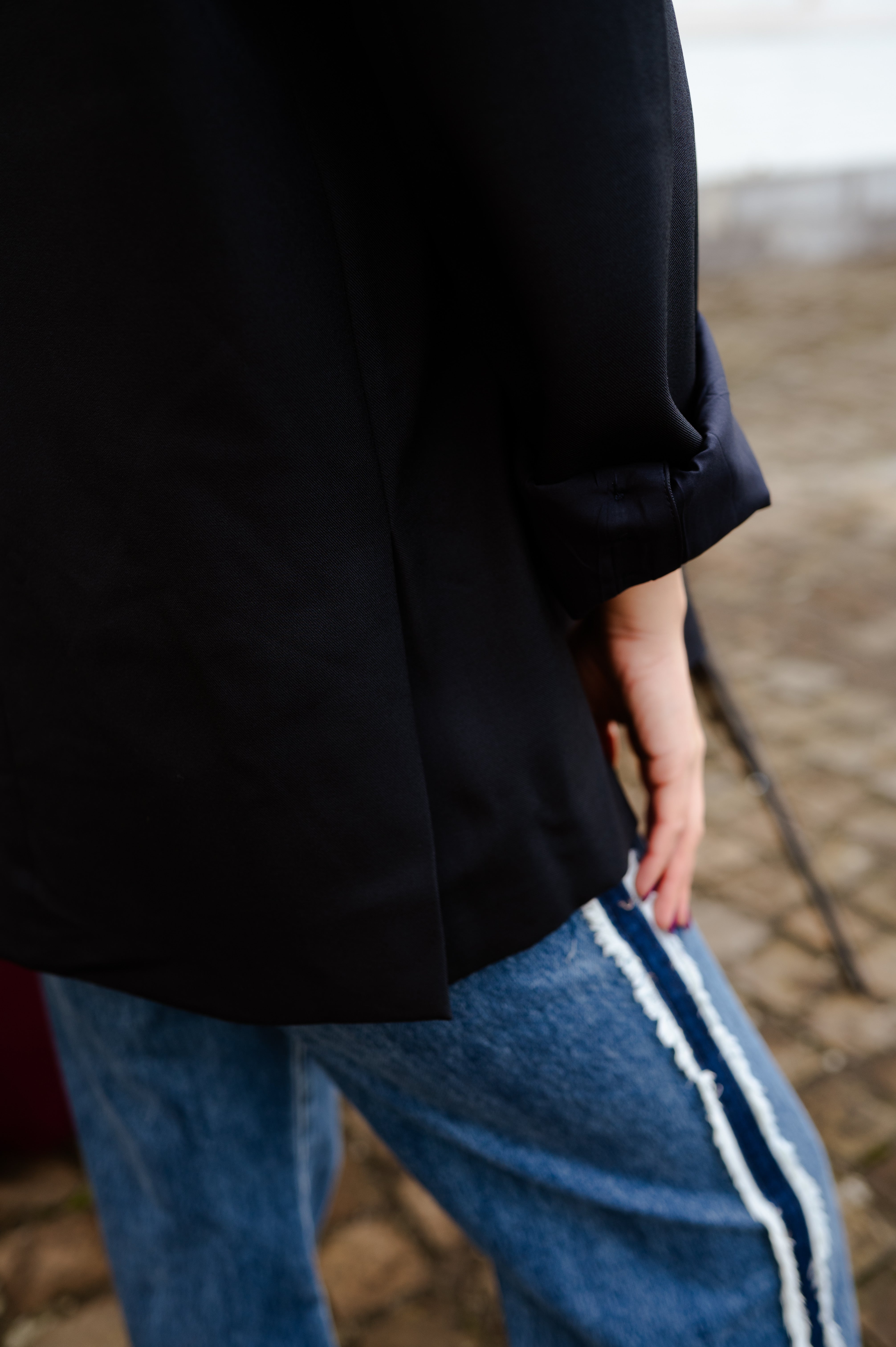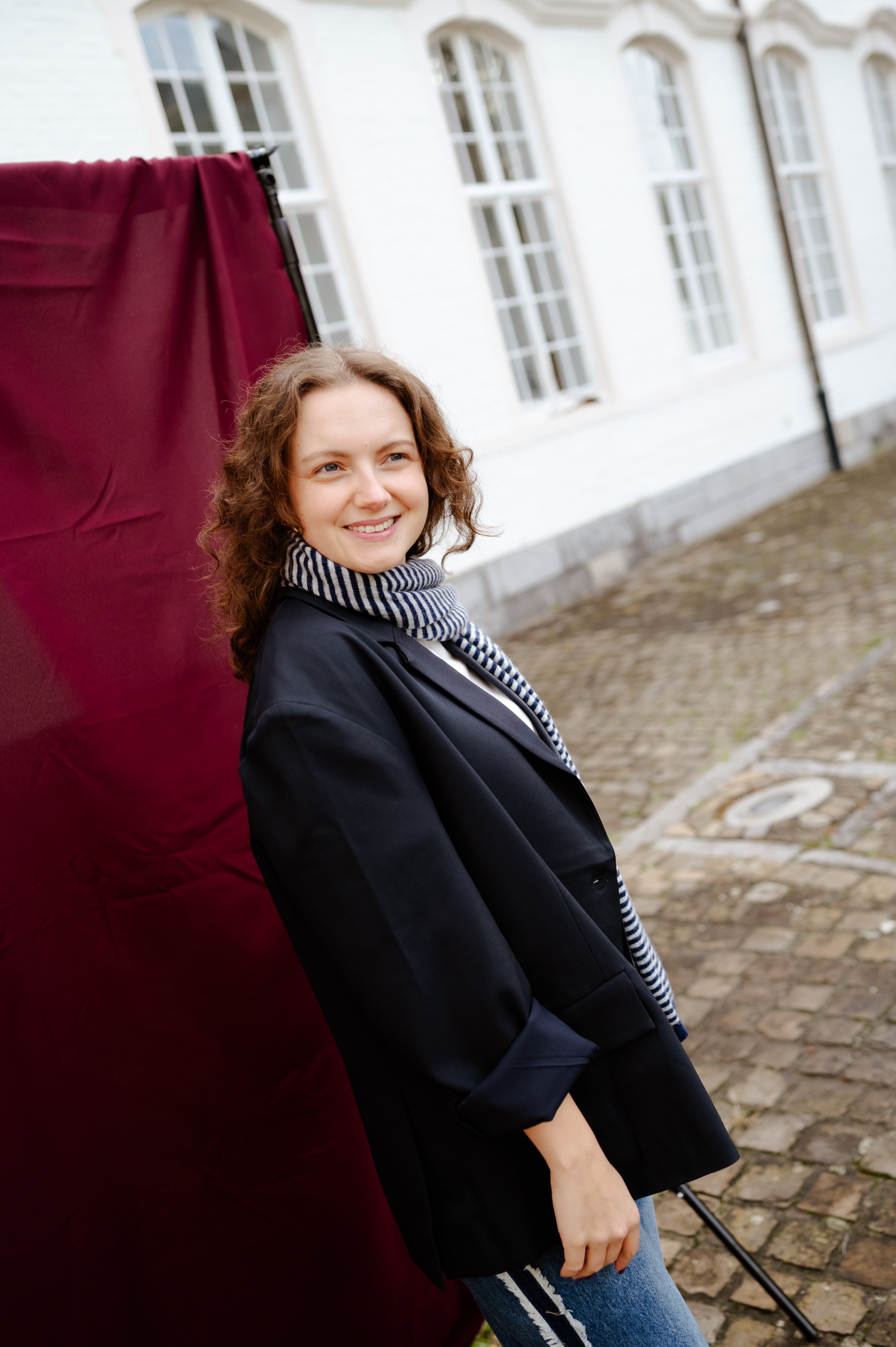 In deze blazer draagt zij maatje M/L voor een oversized effect