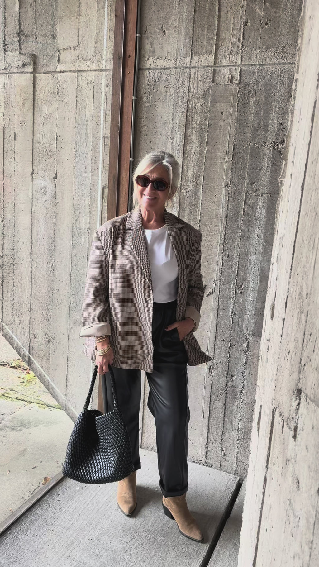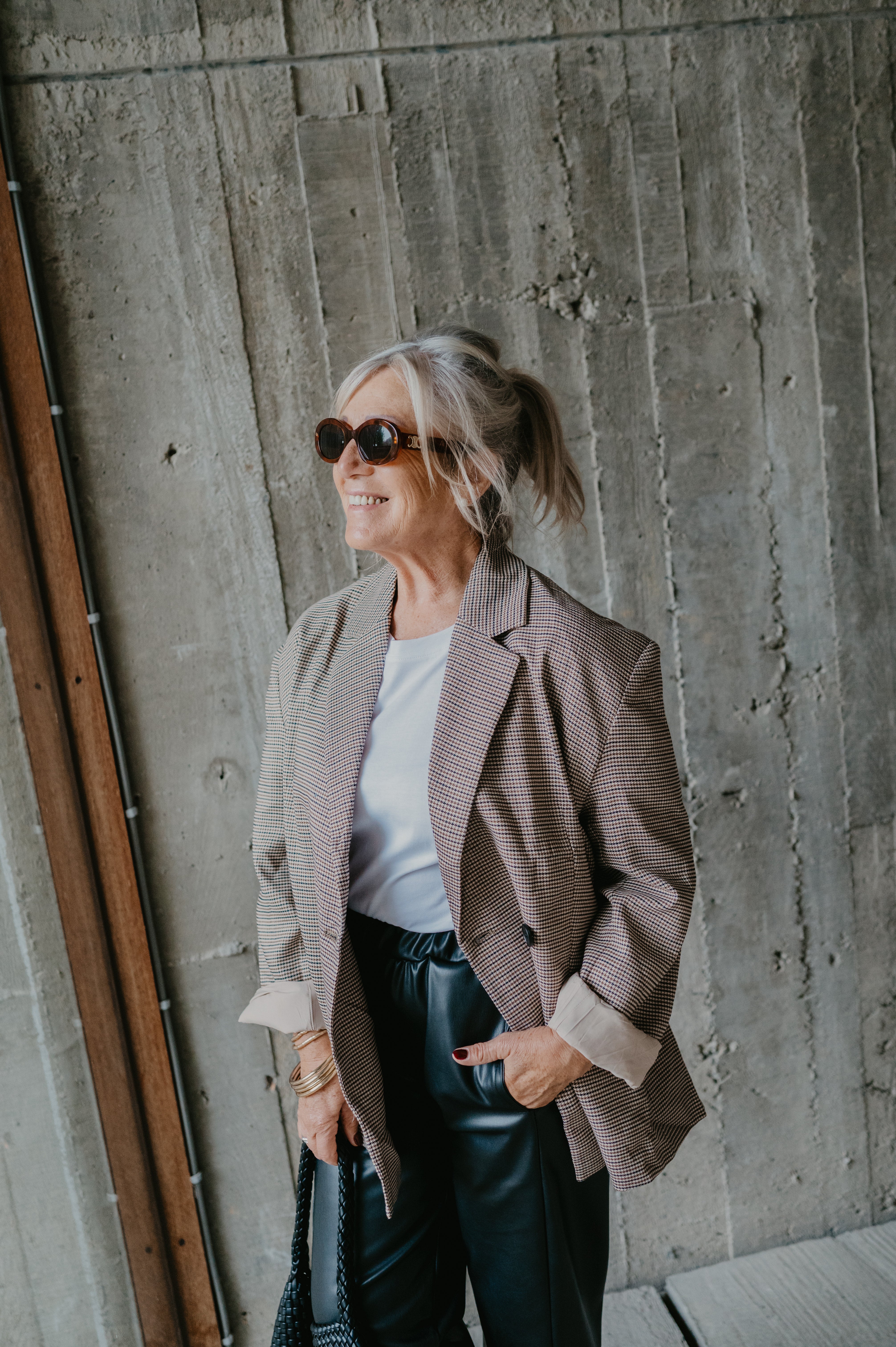 In deze blazer draagt zij maatje M/L voor een oversized effect